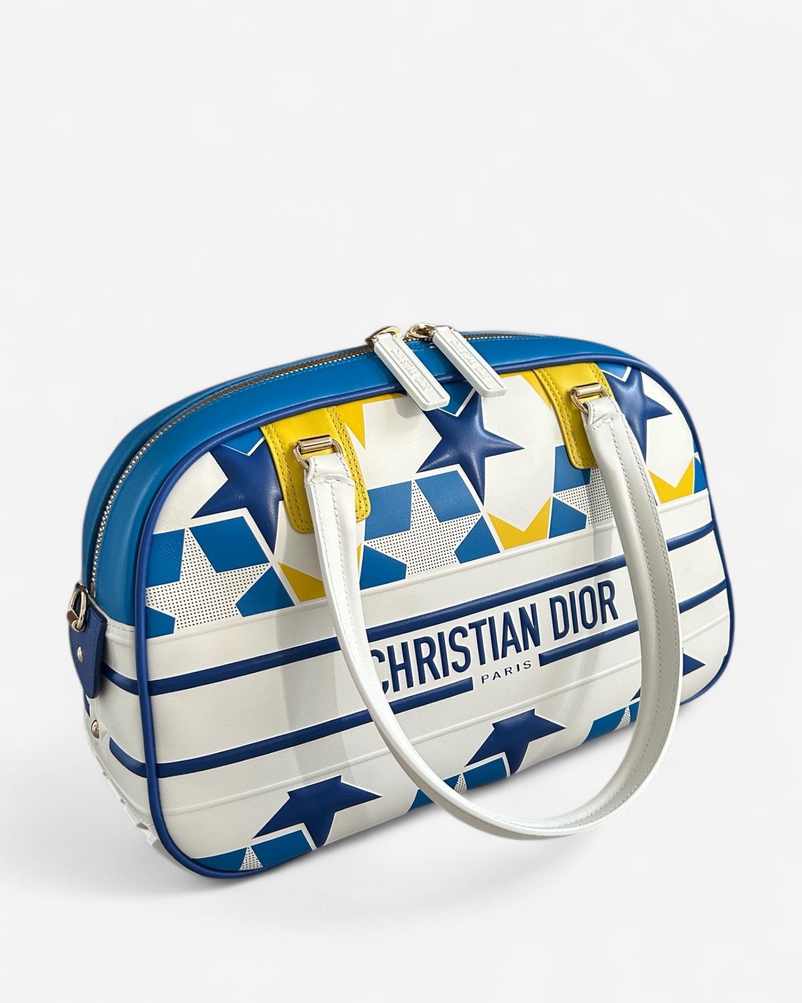 Pre-loved Dior Vibe Bowling Bag Medium. Blue, Yellow & White Calfskin (Cruise 2022 Collection)