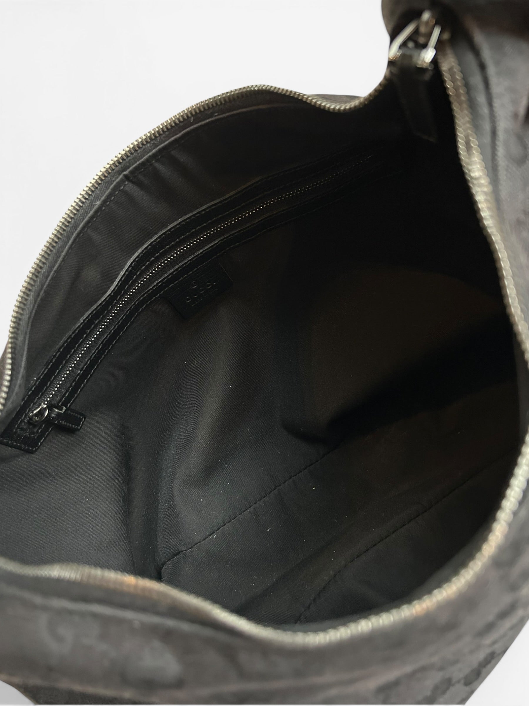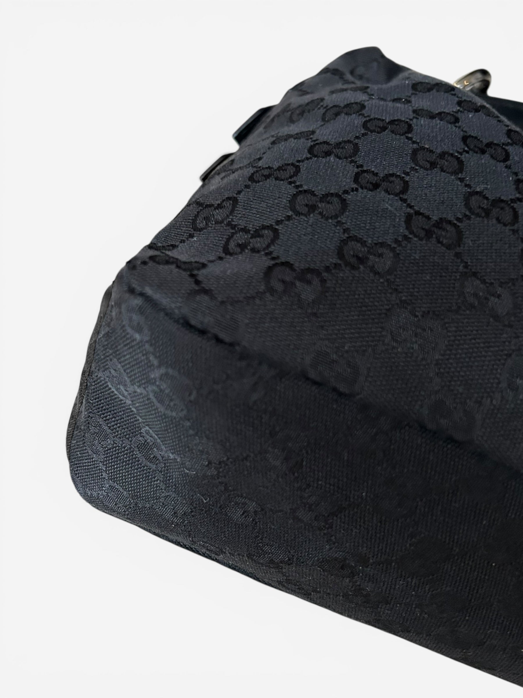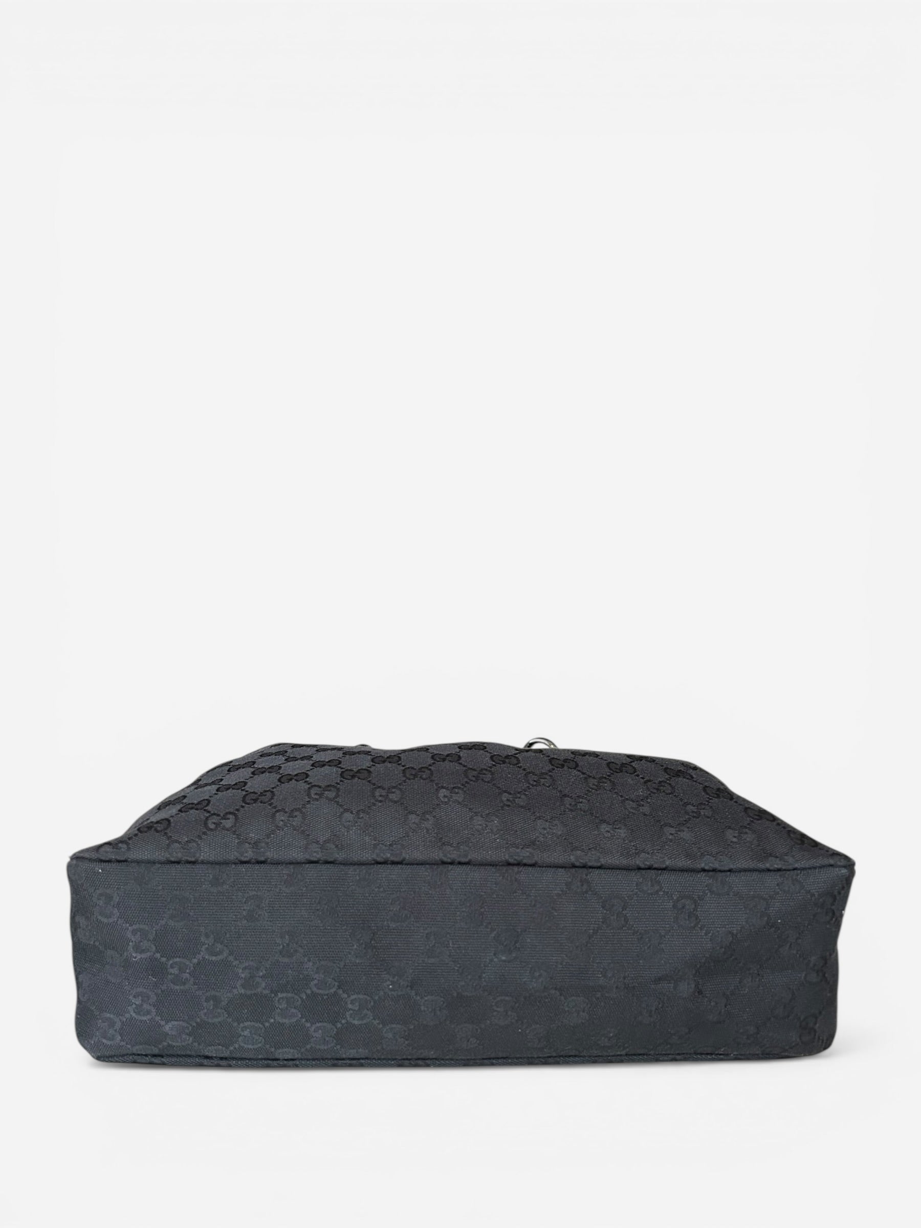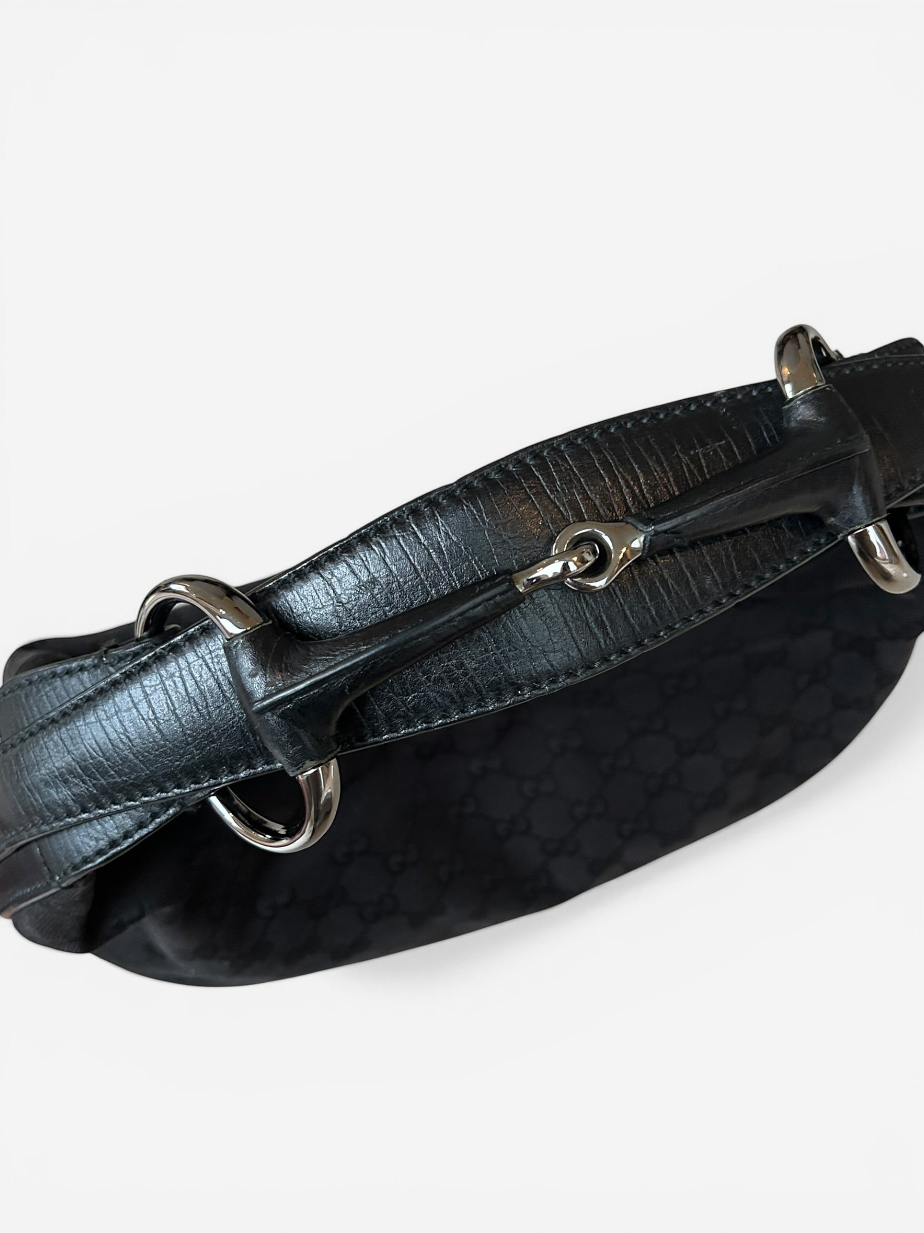 Crafted in signature black GG monogram canvas with smooth leather trim and finished with silver-tone horsebit hardware, this bag balances understated luxury with recognizable design. The soft, slouchy silhouette makes it the perfect everyday bag while still carrying that unmistakable Gucci attitude.